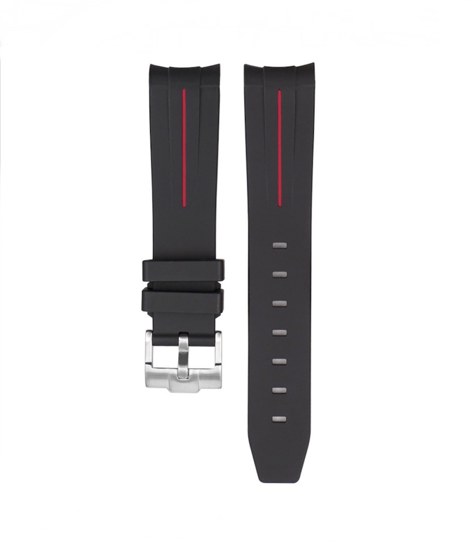 Klockband i gummi. Mjukt och följsamt. Bandet har ”curved ends” (böjda ändar) för att sluta tätt mot boetten.