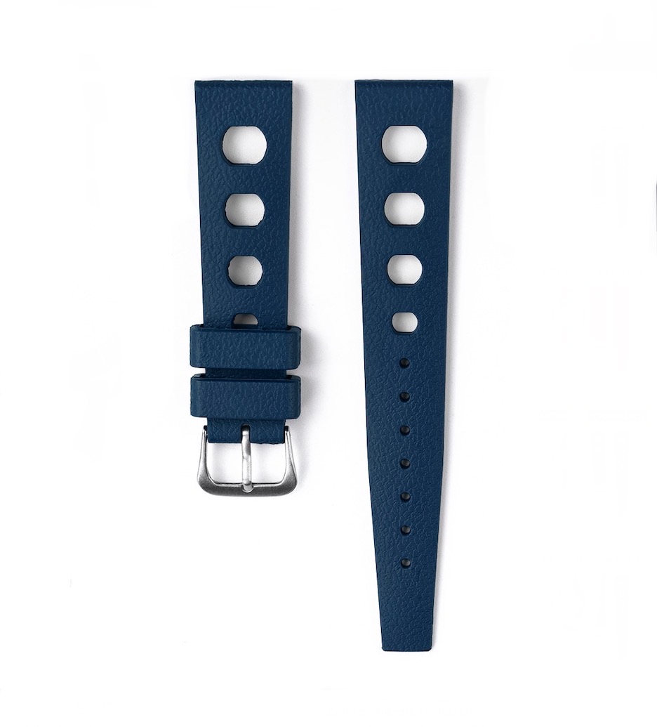 Klockband i FKM-gummi. Mjukt och följsamt. Det är “quick release”-bandstift på denna modell, dvs inget verktyg krävs för byte av band.